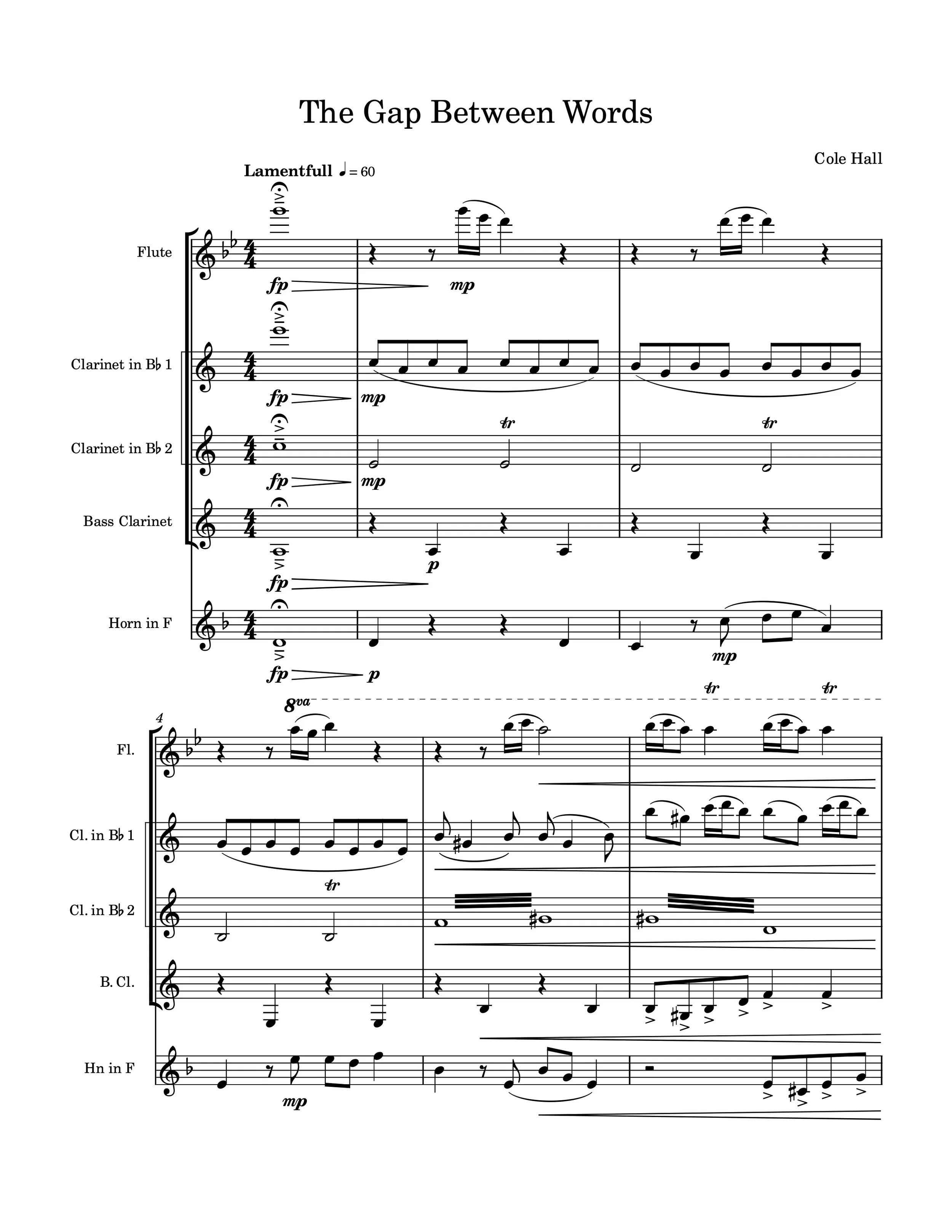 Sheet music titled 'The Gap Between Words' composed by Cole Hall, featuring parts for flute, clarinet in B-flat 1, clarinet in B-flat 2, bass clarinet, horn in F, and other instruments with musical notation.