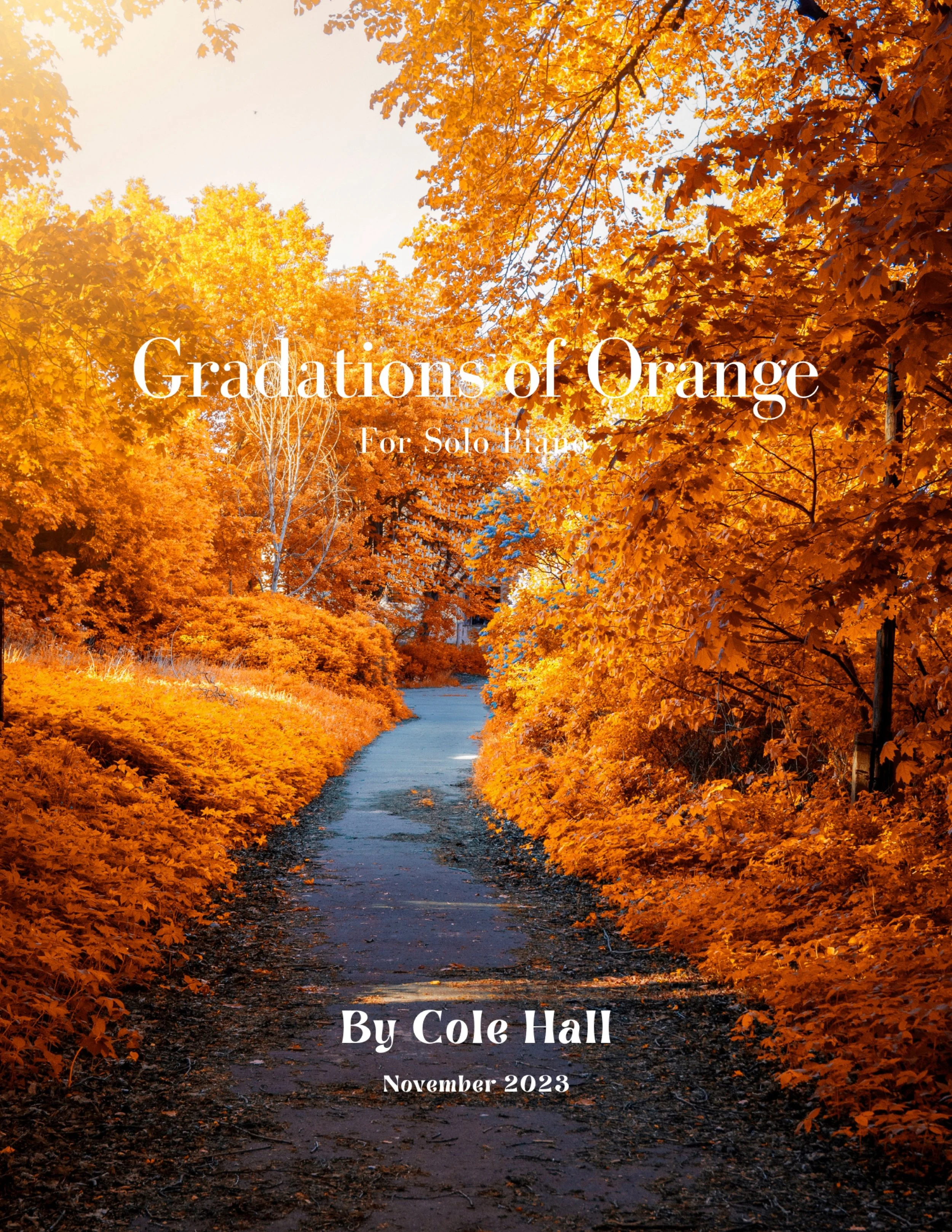 A pathway through a forest with fall foliage in shades of orange. The sky is visible through the trees.