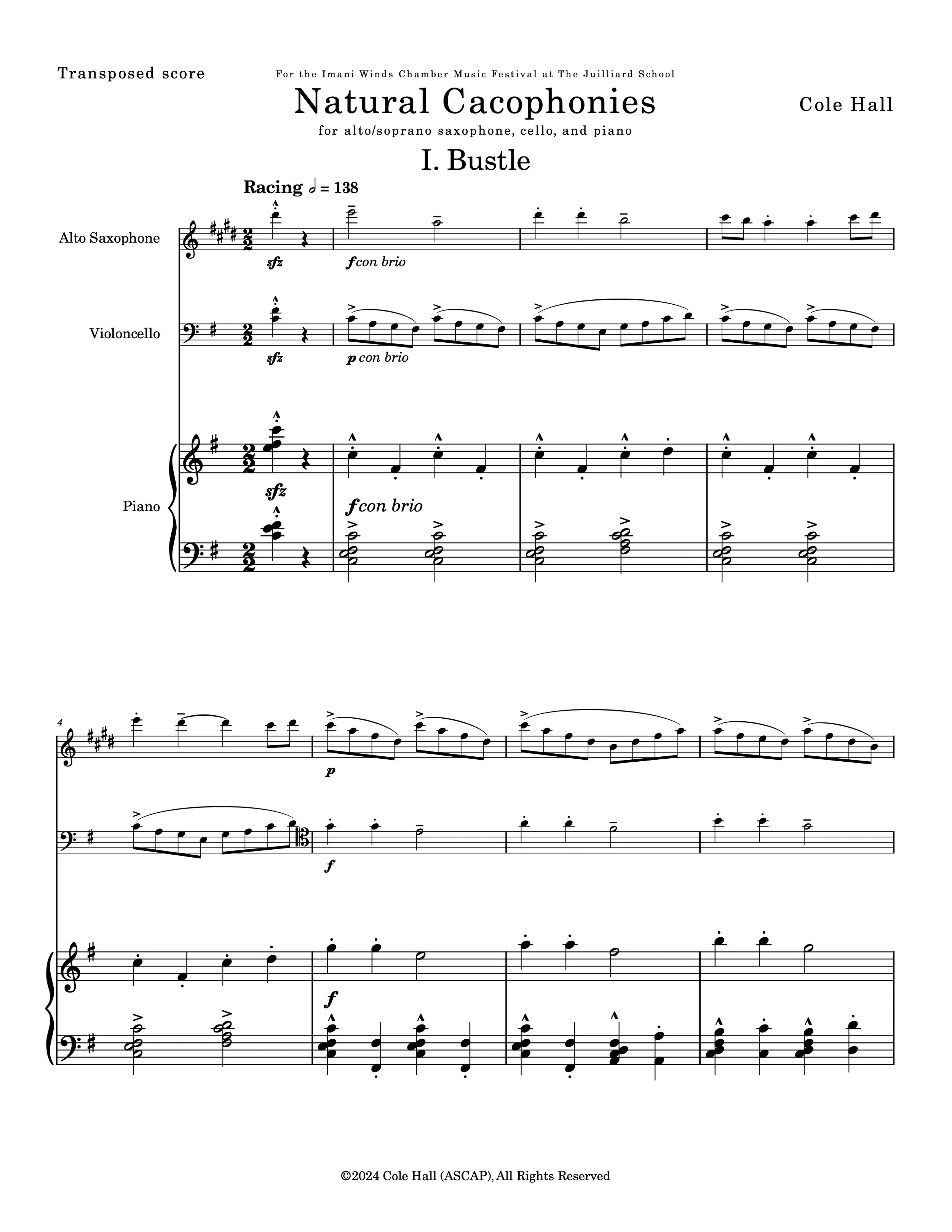 Sheet music titled "Natural Cacophonies" by Cole Hall, for alto and soprano saxophone, cello, and piano, featuring a transposed score with various musical notations and instructions.