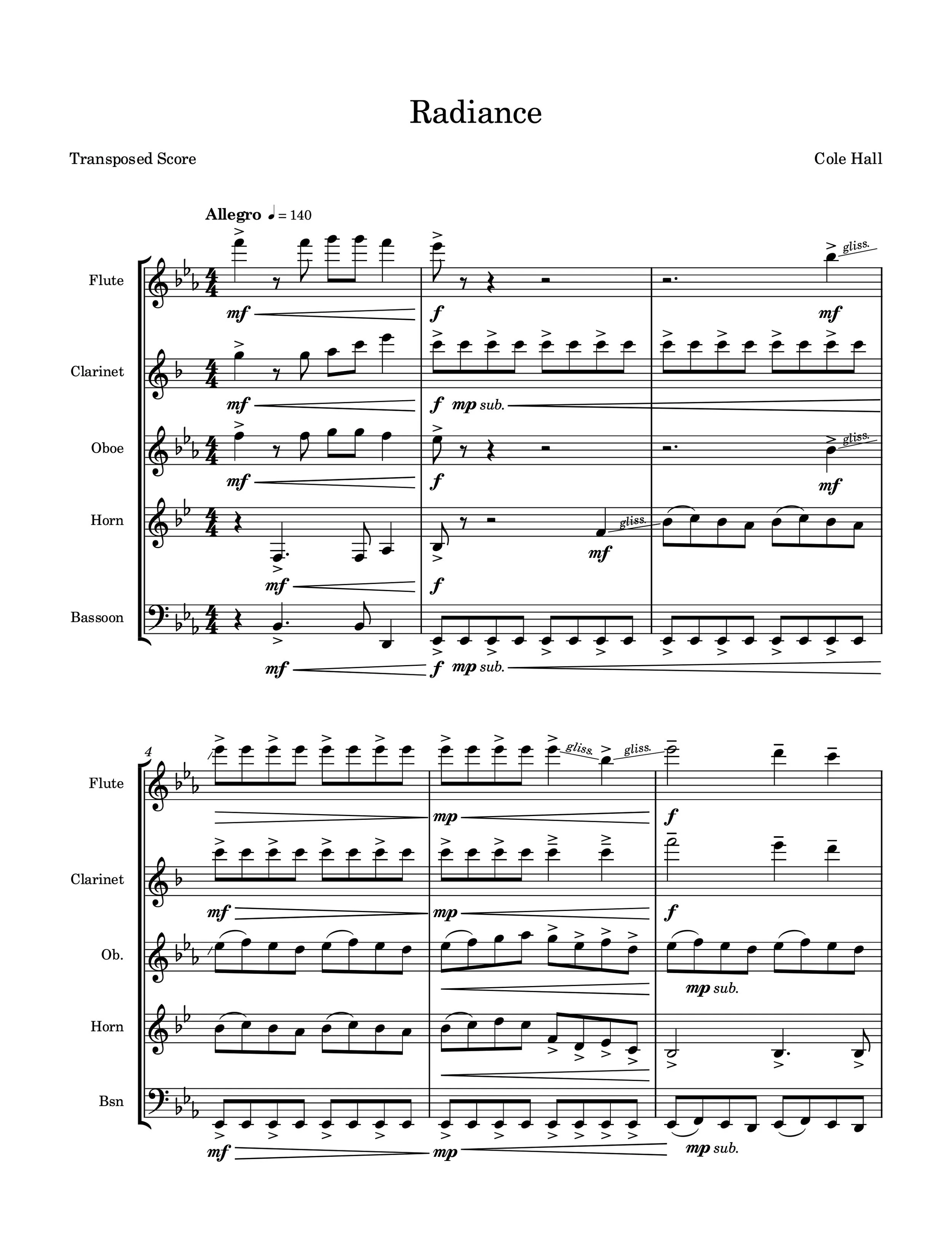 Sheet music titled 'Radiance' composed by Cole Hall for flute, clarinet, oboe, horn, and bassoon, with musical notation and performance instructions.