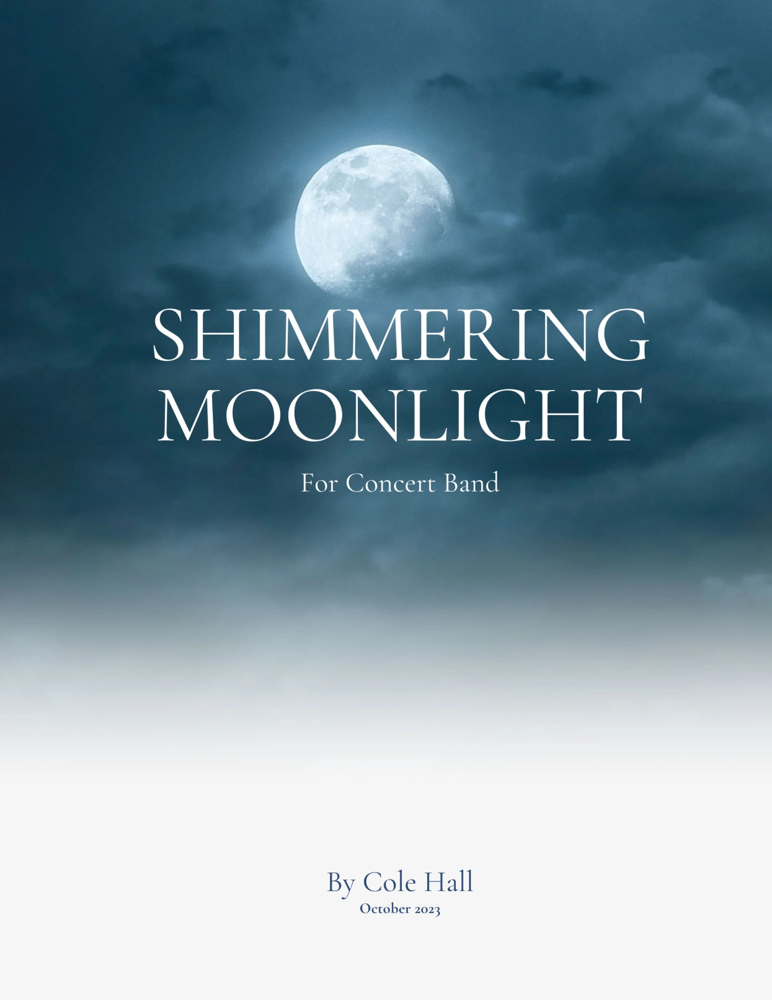 Music sheet cover titled 'Shimmering Moonlight For Concert Band' with a night sky background and a full moon