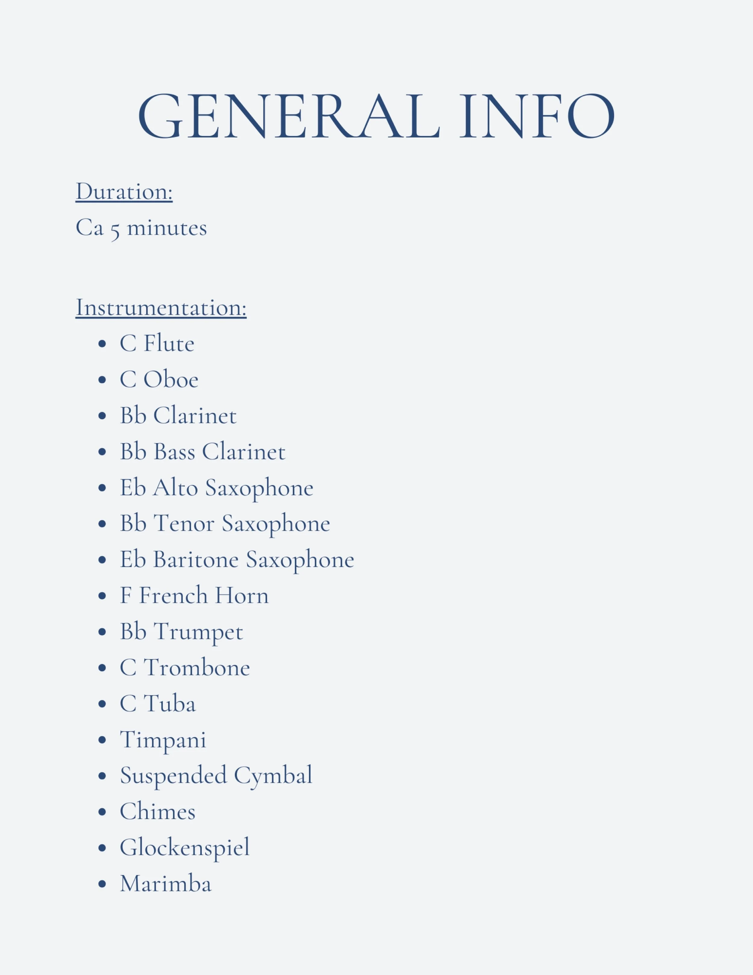 A document titled 'General Info' listing musical instruments including flutes, clarinets, saxophones, trumpets, trombone, tuba, cymbal, chimes, and marimba, along with the duration of approximately 5 minutes.
