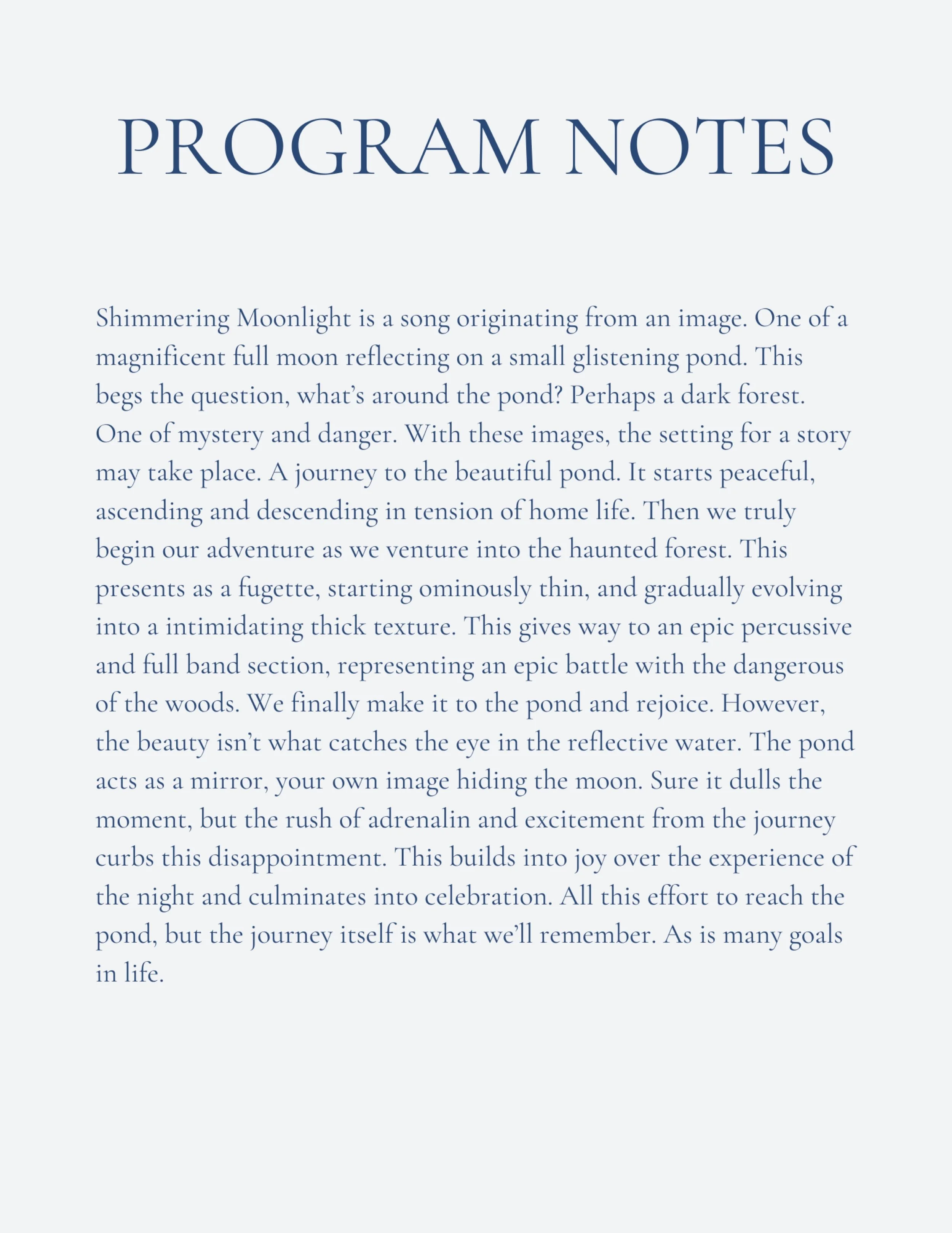 Page titled 'PROGRAM NOTES' with a description of a song inspired by a moonlit pond and a mysterious forest, exploring themes of adventure, reflection, and emotional journey.