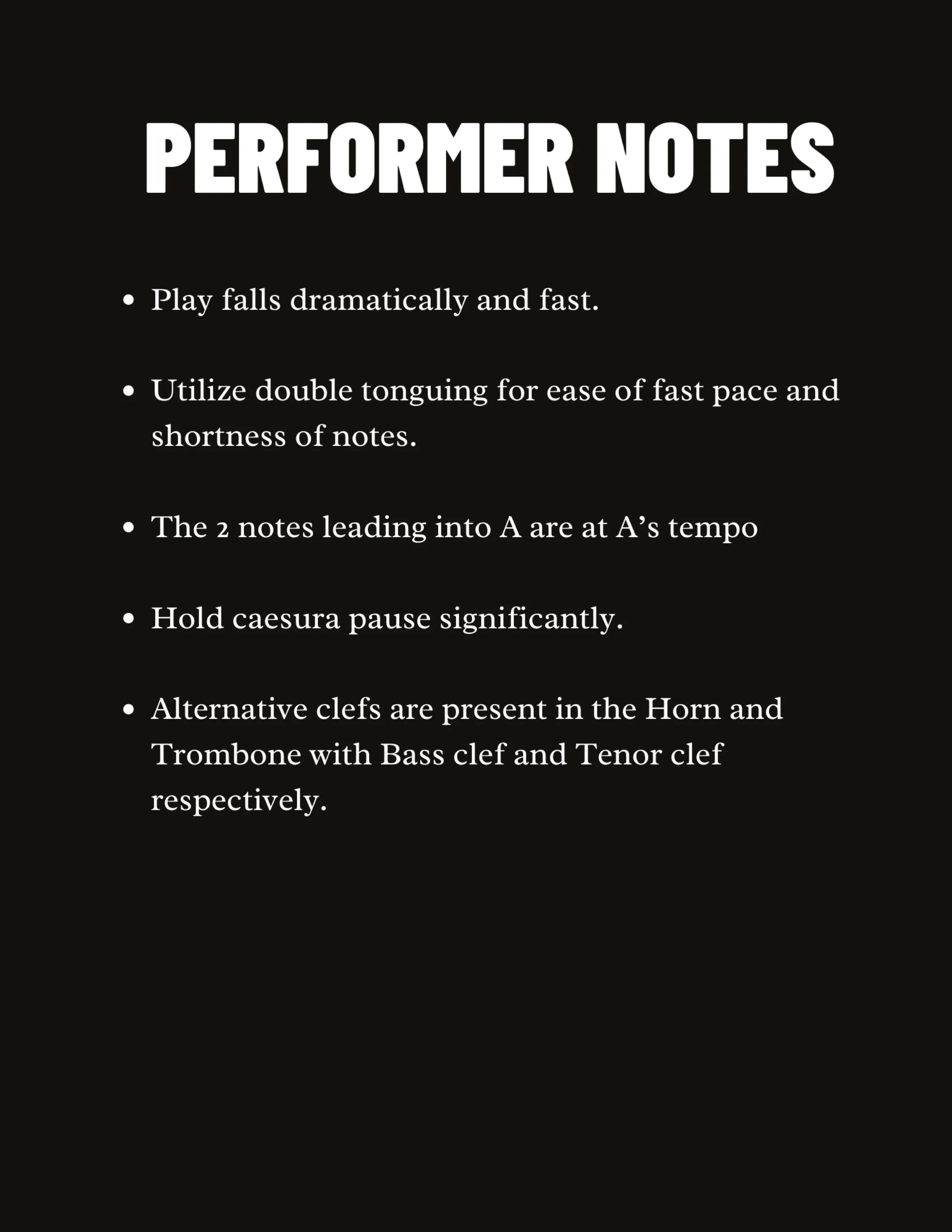 Performance notes with tips for dramatic, fast playing, double tonguing, tempo, caesura, and alternative clefs for horn, trombone, bass, and tenor.