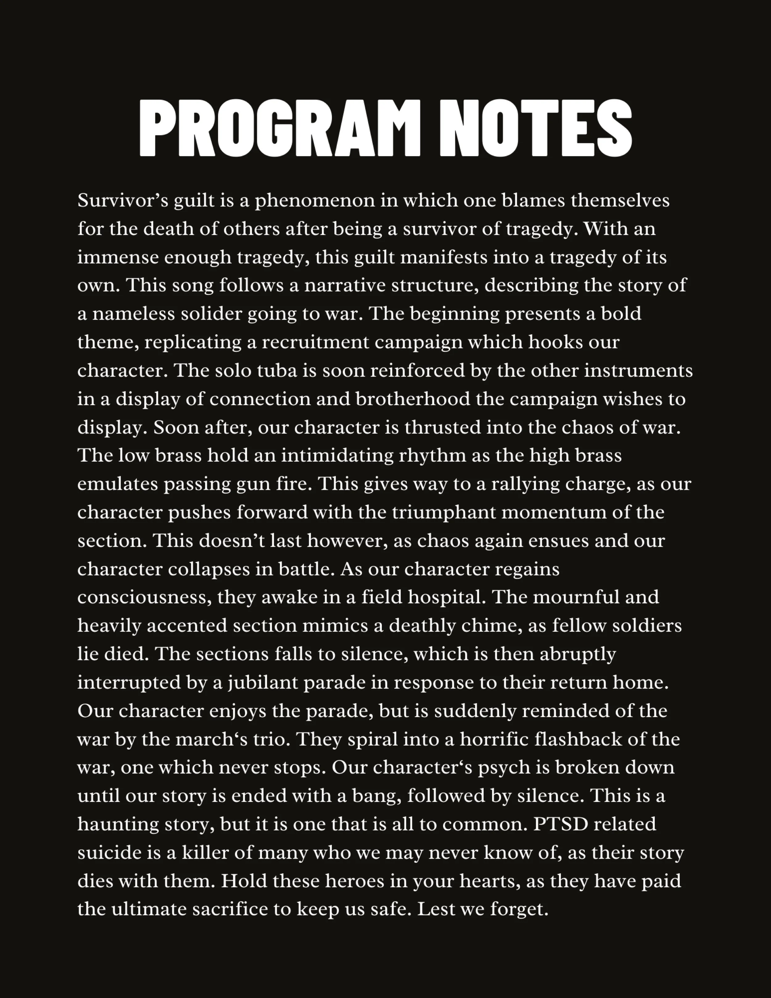A black background with white text titled 'Program Notes', describing a narrative about a soldier, war, chaos, and trauma, ending with a message about PTSD and remembrance.