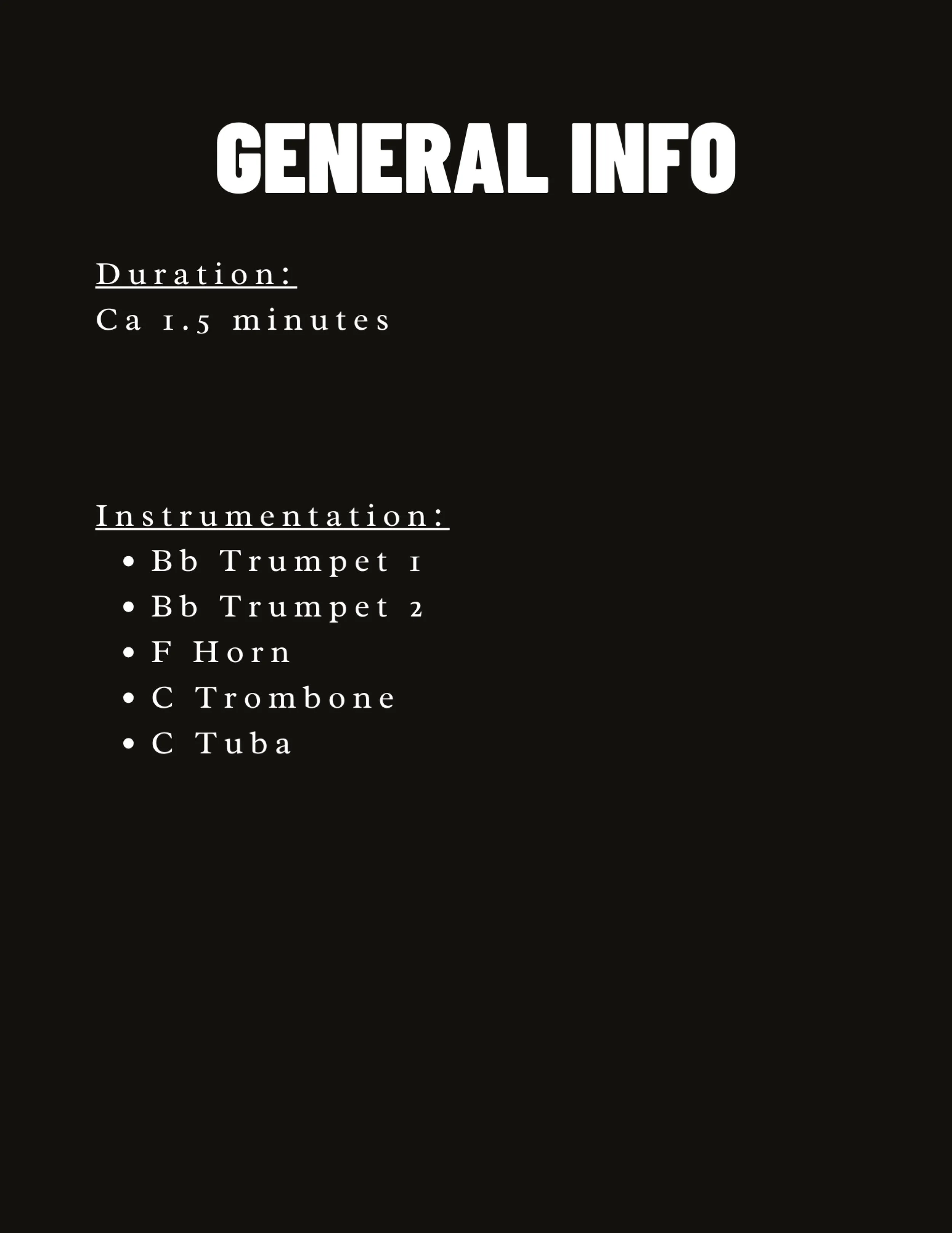 A black background with white text detailing general info about a musical performance, including duration and instrumentation, featuring trumpets, a horn, a trombone, and a tuba.