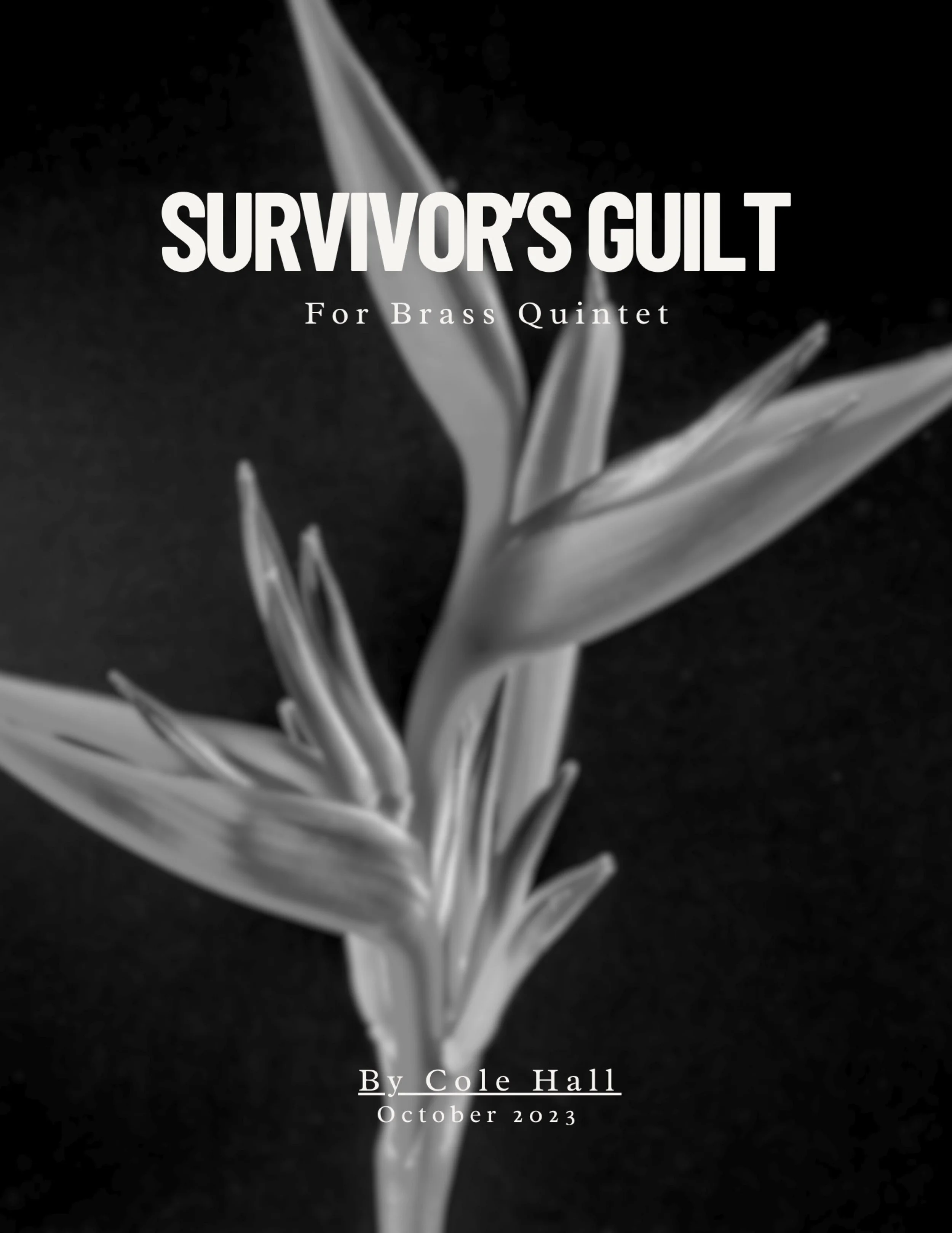 Black and white cover of a music album titled 'Survivor's Guilt' for brass quintet by Cole Hall, October 2023, featuring an abstract image of a flower in monochrome.