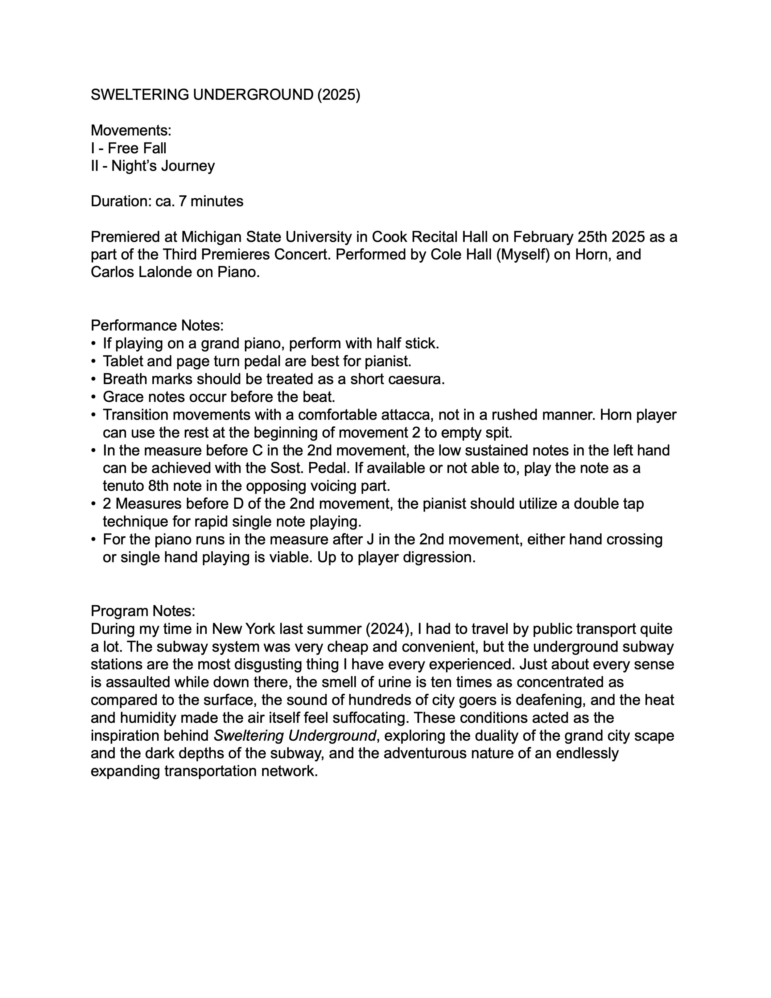 Document titled 'Sweltering Underground (2025)' with information about a performance including movements, duration, premiere details, performance notes, and program notes.